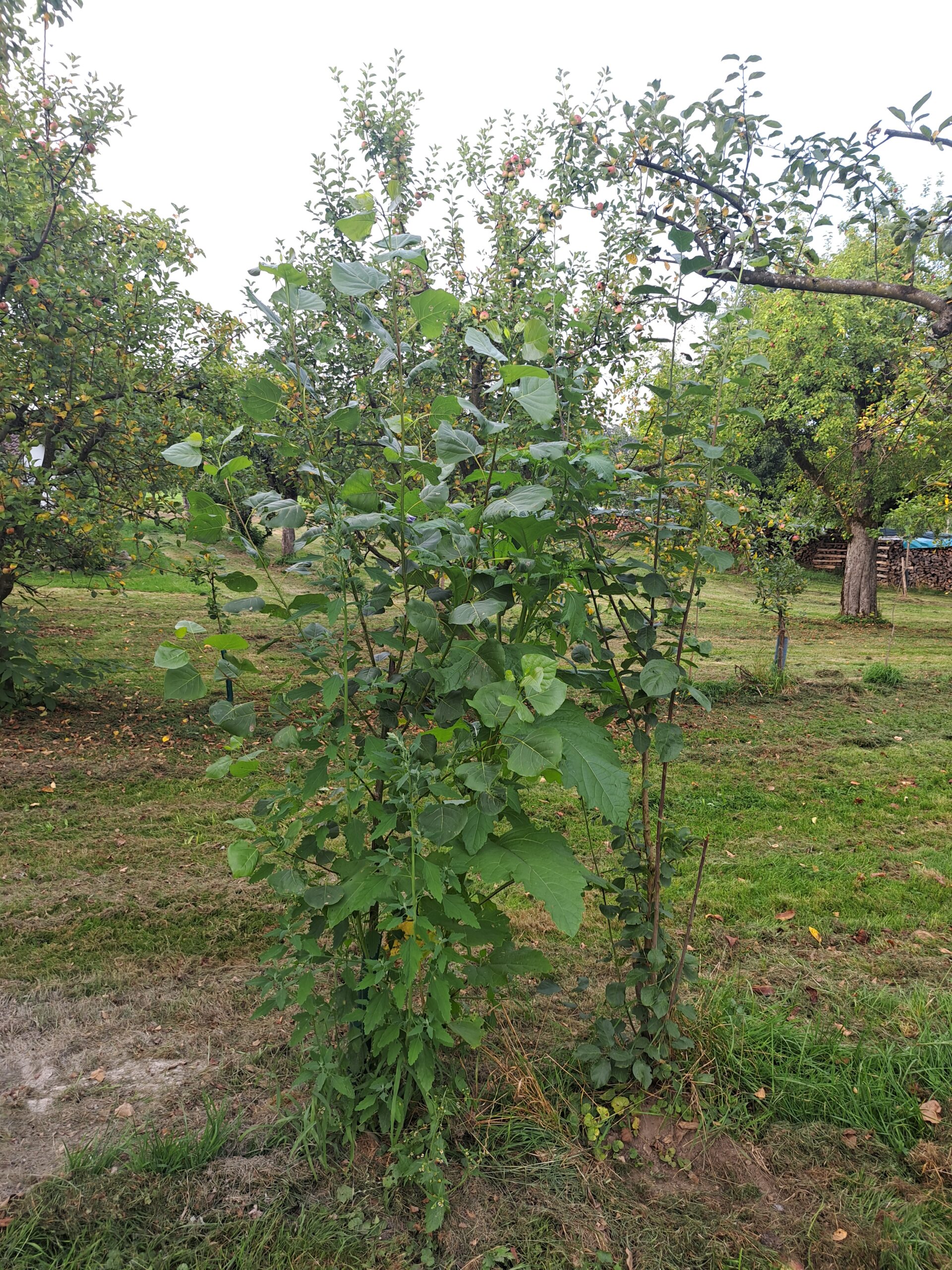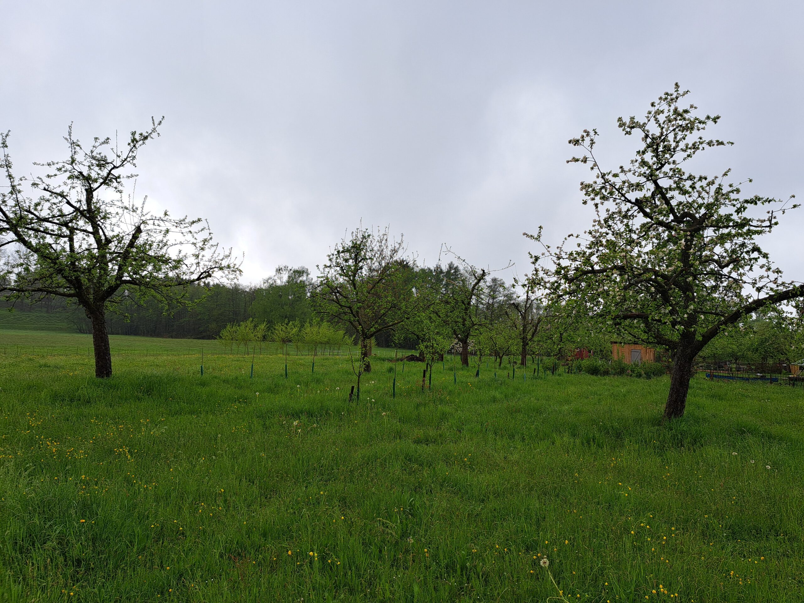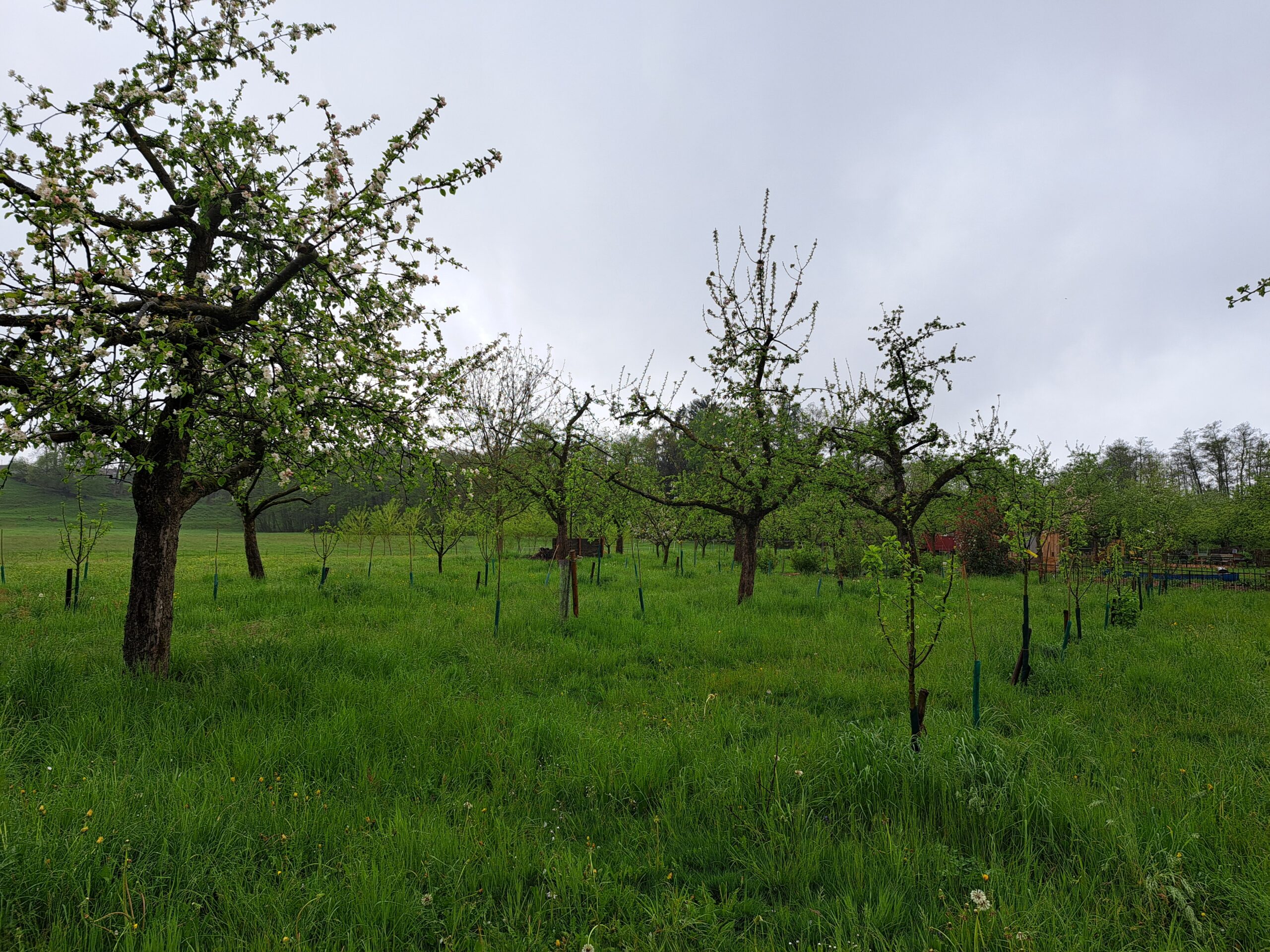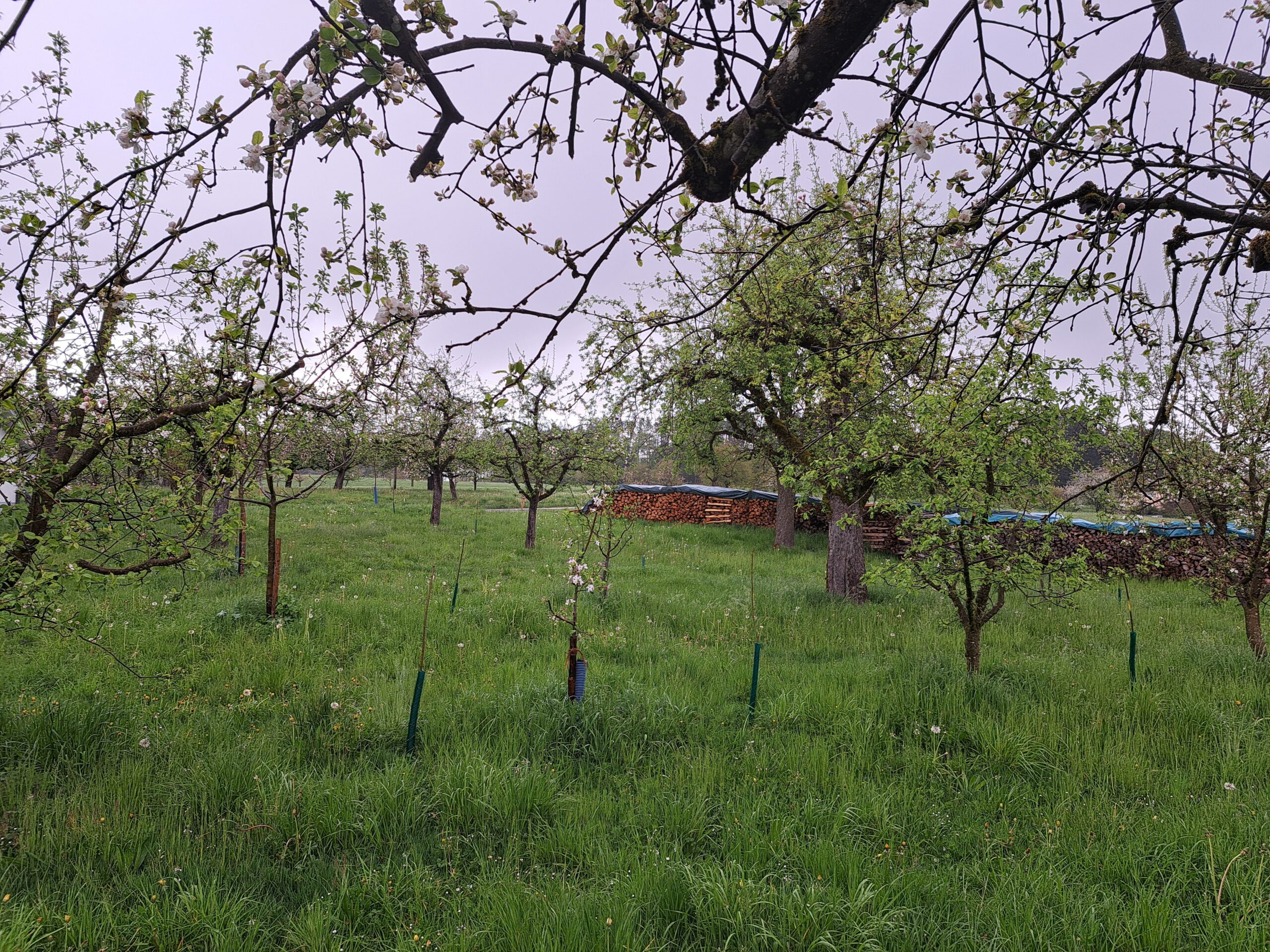 Wir pflanzten 75 Pappeln zwischen Hochstammapfelbäumen mit der Überlegung eine schnellwachsende Baumart zu setzten, die einfach zu pflanzen, hitzeresistent und sehr schnell wachsend ist. Dadurch kann in kurzer Zeit eine bodenschützende und -kühlende Beschattung der Streuobstfläche entstehen. Zusätzlich dazu wird die Flora und Fauna durch eine weitere Baumart bereichert und Lebensraum für Tieren und Insekten geschaffen.